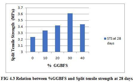 ItisevidentfromthisTablethatSplitTensileStrength and FlexuralStrength increasesupto30%replacementofOPC withGGBFS inconcreteandafterfurtheradditionofGGBFS at 40% replacement of cement, the respective strength decreases However, strength is higher at all replacement levels ascomparedtothatof referralconcrete.Percentage increasein SplitTensileStrength andFlexuralStrength is foundtobe11.41%and14.60%respectively higherwith respecttoreferralconcretemix at28days.