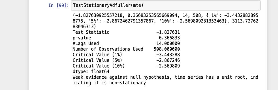 The test considers a null hypothesis. In this case, the null hypothesis is that the time series is nonstationary. A Test statistic gets compared with critical values at different confidencevalues.IfthecriticalvalueexceedstheStatistic, the null hypothesis gets rejected. The time series is stationary.
