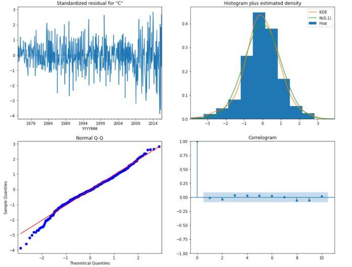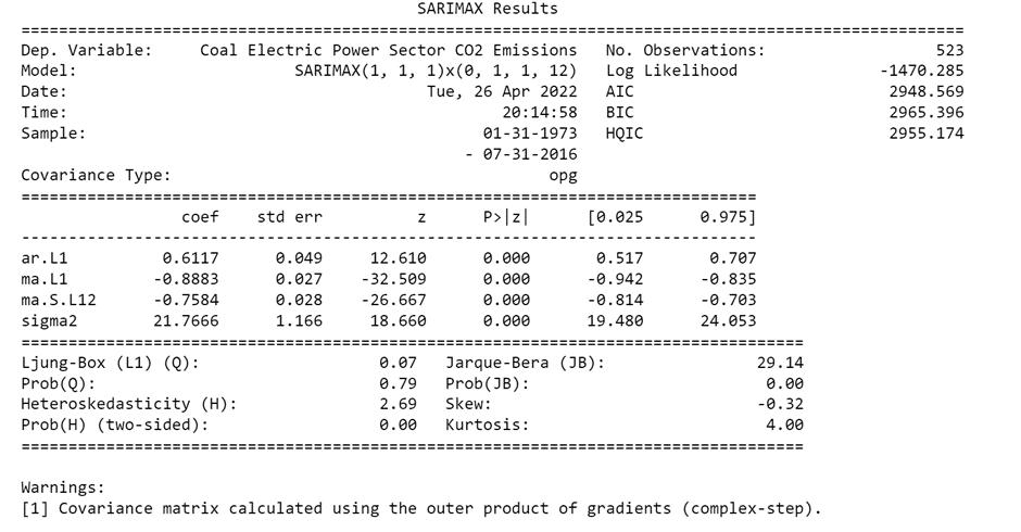 For performing evaluation, we first plotted the Autocorrelation Function (ACF) and Partial Autocorrelation Function (PACF) curve for our seasonal ARIMAmodel.Asfindingtheoptimalparametersmanually graphs is time consuming, we opted for grid search method. Using this method, we explored each and every possible combination of parameters possible. When analyzing and comparing statistical models with various parameters, each can be rated against the others based on how well they fit the data or their ability to properly forecast future data points. A statistical value called AIC was used for the scenario. For this example, weare taking emission values only for Coal Electric Power Sector. The Akaike Information Criterion value measures how well a model fits our training data. It is calculated using the number of independent variables, and the maximum likelihoodestimateofthemodel.AICvaluesareonlyuseful incomparisonscenarios.AlowerscoreofAICindicatesour model is performing well. After performing hyperparameter tuning through grid search, the SARIMAX (1, 1, 1)x(0, 1, 1, 12) yielded the lowest AIC score of 2003.553. Hence, we considered these conditions for our proposedmodel.Nextstepwewentforin depthanalysisof themodelwiththeabove mentionedparameters.
