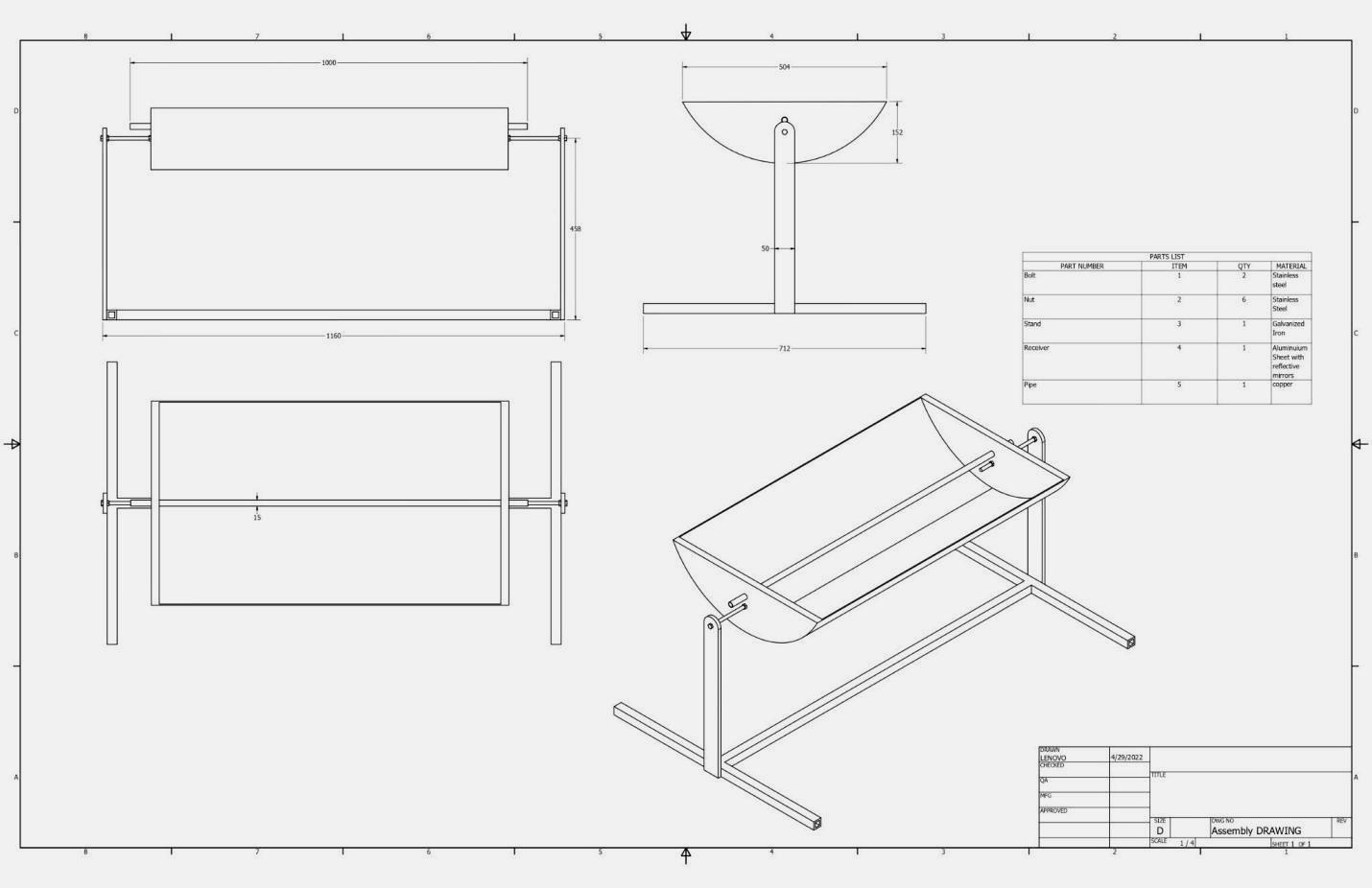 Materials:Receivertube Copper,Troughsheet Aluminiumsheetwithreflectingmirror,Stand StainlessSteel