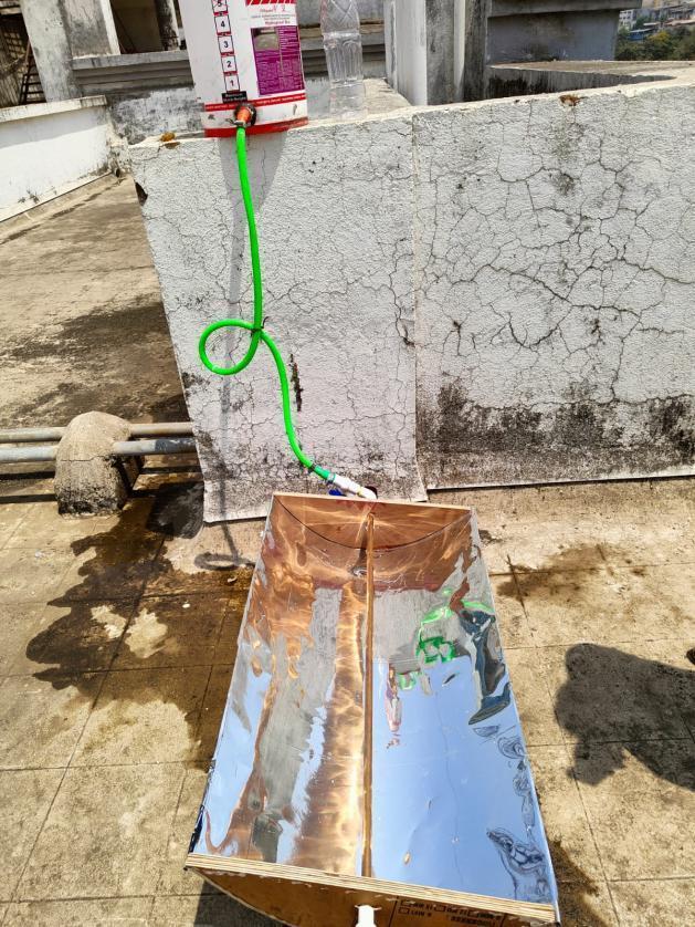 The collector’s reflecting surface iscurved in a parabolic shape so that the solar radiations which are colliding are getting reflected most of all the radiations to the receiver tube. In our study, as a reflecting surface, the type of reflector material used is mirror film to evaluate the performance of the parabolic trough collector. A copper pipe was chosen because of its higher thermal conductivity than aluminium tube or any other plastic tube. a copper tube of 0.013m internal diameter was used at the focal axis. All the components of the receiver tube and parabolic reflector were mountedonastandwhich was basically a supporting structure.Thestructureframesupportstherotation axisofthe parabolic reflecting surface. To reduce cost, the structure was made from galvanized iron rods which were welded together.Aplasticpipeconnectedtheinletwiththestoragetank.Theoutletfluidtemperaturewasrecordedwiththehelp of a thermometer. The flowratewassetat0.3lpm.Thetablebelowshowstheinletandoutlettemperature obtainedat 0.3lpmon12th ofAprilatTernaEngineeringCollege,NaviMumbai.