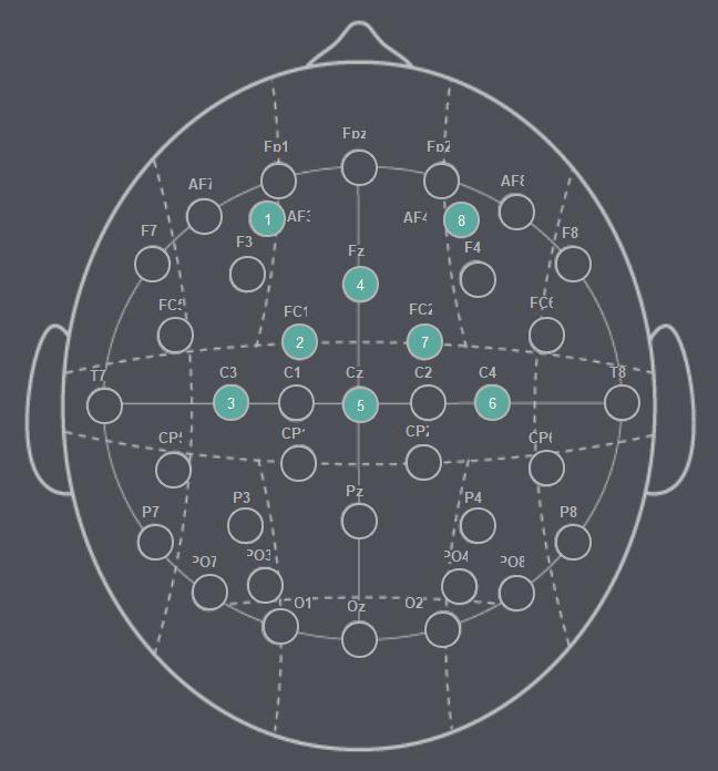 TheEnobio8channelEEGdeviceisusedtoforEEGsignal acquisition.The8electrodesnumbered1to8areplacedin theinternational10 20systempositions“AF3”,”FC1”,”C3”, ”Fz”, ”Cz”, ”C4”, ”FC2” and “AF4” respectively, so they can capturebetawavesfromthefrontallobe.Figure1showsthe positions of the eight electrodes on the scalp. The data is collectedwhilethesubjectexecutesmotorimagerytasksof imagining movement in therightarm in four directionsin center outmotions as well as individuallyblinking theleft andrighteye Theidlestateoftheuserisalsocapturedso thattheCNNmodelcandifferentiatebetweenidleandnon idle states. This is done to ensure that the model does not execute an action in Windows when the user is idle (for example; when the user is reading, watching a video or image.)TheLabStreamingLayer(LSL)featureoftheEnobio software is used to stream the raw EEG data to a python program,whichwritesittoacommaseparatedvalues(CSV) formattedfile.Thisisdoneforeachofthesixuseractionsas wellasa restingstate,consequentlygenerating7csvfiles. The sampling rate used is 500 samples per second. The duration of each EEG recording is 2 seconds. Each csv file contains a 100 such recordings. Each recording contains 1000rowsand8columnscorrespondingtothe8channels.
