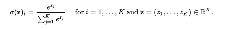 Itappliesthestandardexponentialtoeveryelementinthe inputvectoranddivideseachexponentialbythesumofall theexponentialstonormalizethem.Thesumoftheelements oftheoutputvectoris1.Thesoftmaxfunctionforaninput vectorzofKrealnumbersisdefinedas,