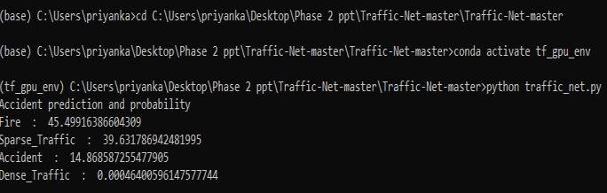 In figure 13, accident is detected, we can observe the predictionsandprobabilities.Thepredictionsaredonefor identifyingfireinthescene,sparsetraffic,densetrafficand accidents.