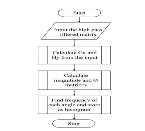 WeutilizeastrategycalledHistogramOrientationGradient (HOG) to extract the highlights from the pre processed picture gotten as input. In Figure 5 we can observe the featureextractionfromtheimage.Itincludesdifferentsteps likefindingGxandGy,whicharegradientsabouteverypixel within the x and y axes. After calculating Gx and Gy, magnitude and angle of each pixel is calculated using the formulaementionedbelow.