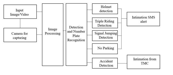 Thefigure2depictsthebasicsystemarchitecturewhich includestheinputimageasavideothroughcameraandthis imageisprocessedandifanyviolationsthenhelmet,triple riding,signaljumpingandnoparkingarealldetected.