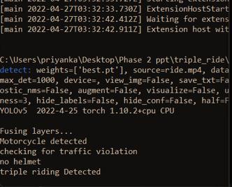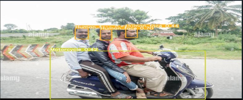 When the figure 10 is uploaded, at first Motorcycle is detected,thenitschecksforotherviolationsandidentifies the violation as triple riding and no helmet violation is detectedasshownbelow.