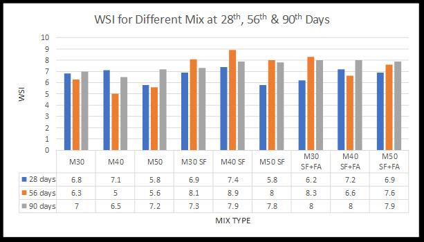 Fig. 5 reveals that test results for 28th day’s exhibit satisfactoryWaterSorptivityIndex(WSI)indexalmostfor allthemixesmaybebecauseofsaturationofcapillarypores bywater.WSIindexisfoundtobethemaximumat59days foralmostallmixes.Effectofadditionofmineraladmixtures hasnotbeenprovedtobeefficientinreductionofWSIindex. Itcanbesaidthatmineraladmixturesdonotplayanyrolein absorptionphenomenon.