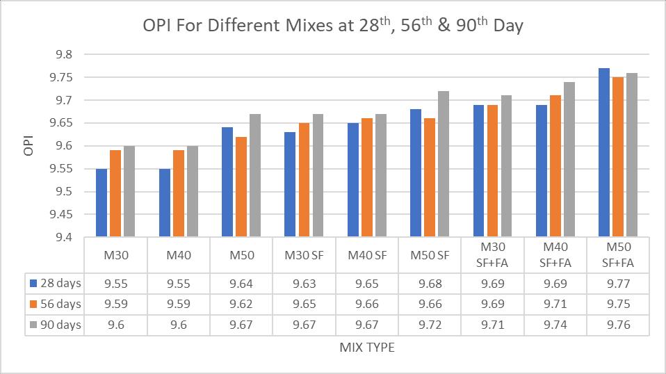 Testresultsofoxygenpermeabilitytestfor28th,56thand90th days are indicated in Fig. 4. It is found that Oxygen PermeabilityIndex(OPI)almostremainssameatdifferent ages.Therefore,thisindexshall beevaluatedon28th days whichisrepresentingforremainingperiodaswell.Thereis no much enhancement of value of OPI after 28 days. Test resultsarerangingfrom9.55to9.77forallthemixeswhich fallinthecategoryofgoodresistanceagainstpermeability. OPIvalueisfoundtobetheminimuminconcreteproduced withOPCforeachgradewhichindicatesthatuseofOPCmay notbesuggestedfordurabilitypointofview.Asthegradeof concreteincreases,OPIvaluealsoincreases. Highestvalues ofOPIarefoundtobeinternaryblendedconcreteineach grade. Therefore, ternary blended concrete proves to the bestfordurableperformance.Binaryblendedconcretei.e., OPC+SFindicateOPIlessthanternaryblendedconcrete.Itis