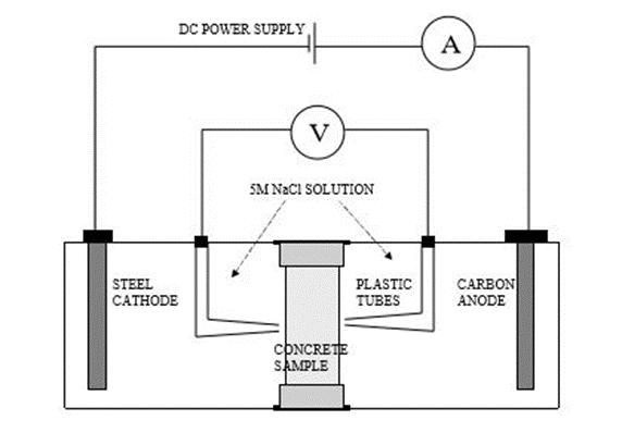 Diffusionistheprocesswherefluidsorionsmovethrougha porousmaterialundertheactionofaconcentrationgradient. Diffusionoccursinpartiallyorfullysaturatedconcreteandis the dominant internal transport mechanism in marine environment. Diffusion rates depend upon temperature, saturation level of concrete, type of diffusant, chemical interactions and inherent diffusibility of the material [11]. Chlorideconductivitytestingforwhichtestsetupisshownin Fig.3hasbeenfoundtobesensitivetochangesinconcrete microstructurecausedbyw/cratio,initialcuring,andtypeof binder. The type ofcementitious material hasa significant effect on chloride conductivity. If the chloride value falls below 0.75 mS/cm, it is considered to have an excellent chlorideresistance.Ifitfallsbetween0.75and1.5,ithasgood chlorideresistanceandabove1.5,itisconsideredtobepoor chlorideresistance.