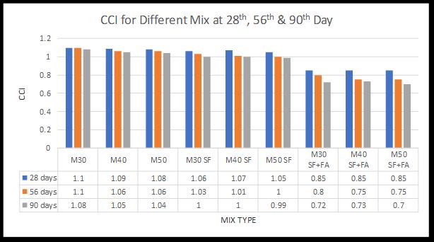Fig.6revealsthatChlorideConductivityIndex(CCI)value decreases with the age of concrete. However, CCI value indicatesgoodperformanceofallthemixesat28th days.As the grade of concrete increases, CCI index decreases marginally, therefore, imperviousness is enhanced by increasingcompressivestrengthofconcrete.CCIindexgoes onimprovingwhenmineraladmixturesareusedinbinary andternarymixesofallgradesofconcrete.Diffusionprocess is affected by addition of mineral admixtures in concrete. Ternaryblendedconcretemixesexhibitexcellentchloride diffusion resistance being value less than 0.75 at 90 days. Blendofsilicafumeandflyashisconsideredtobethemost effectiveresistanceagainstchloridediffusion.