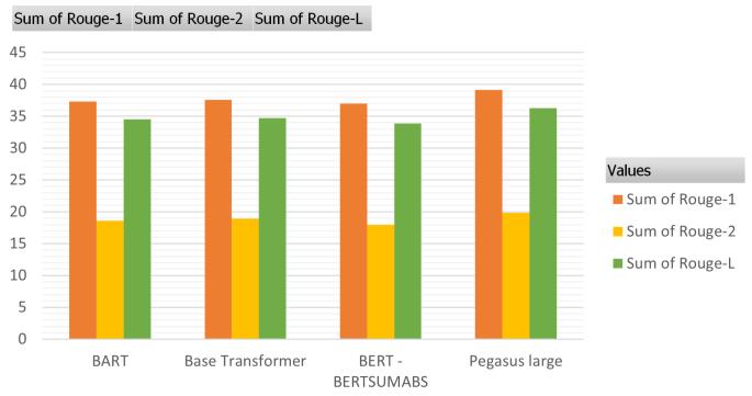 Base Transformer 37.57 18.9 34.69 BERT BERTSUMABS 36.97 17.96 33.87 PEGASUS Large 39.12 19.86 36.24 T5 BART 37.28 18.58 34.53