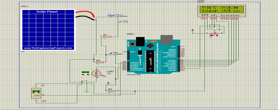Thissetupdisplayshowthevirtualworkingmodulewilllook like.Voltage,LDRandTemperaturesensorsofpanelactsas input for Arduino Mega. LCD will display voltage, temperature and light intensity wherein Arduino acts as interface between LCD and input sensors. As the temperaturewillincreasearoundthesolarpanel,Arduino willupdateitonLCDdisplay.TheLightDependentResistor willcalculatethelightintensityaroundthesolarpaneland willdisplayonLCD.