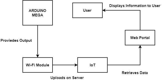 Asshowninfigure4ArduinoMegawillbeusedtoprovide outputtoWi Fimodulewhichwillfurthermoreuploadthat informationtoIoTfromwhichWebportalretrievesthedata andprovidesittouser.