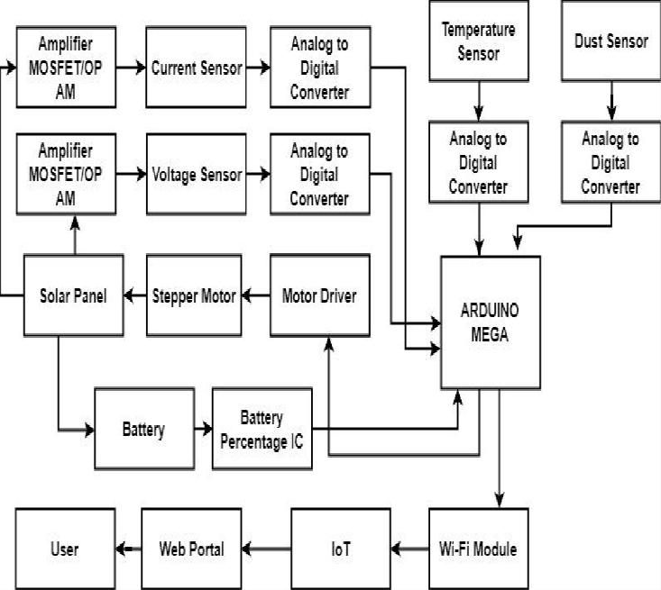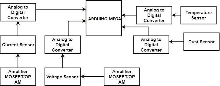 The system uses current and voltage sensors to measure currentandvoltagerespectivelyproducedbysolarpanels. Sincethevalueofcurrentandvoltageproducedisverysmall amplifiersareusedtoamplifythecurrentandvoltageinthe measuringrange.TemperatureandDustsensorsprovidethe realtimedataregardingheatandsoilingeffectrespectively. Sincetheoutputgeneratedbyallsensorsisinanalog,analog todigitalconverterisused.