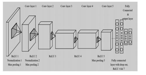 After all convolution layer and the final two fully connected layers, a non linear, non saturating activation function called ReLu is used. The speed is increased. To address the over fitting, the dropout is added to the network. The dropout will enhance network performance during the testing phase. This model makes advantage of batch normalization to boost speed, performance, and neuralnetworkstabilityshowninthefig 4.