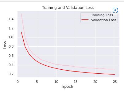 The loss for the model's generated by training and Validation graphs is displayed in the fig 7 below. As the epochgets bigger, the loss gradually decreases. When opposed to training loss, validation loss is less. The model'slossisatitslowest,20%,atthe25thepoch.