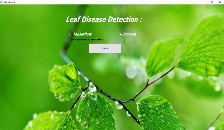 Theotherinterface,denotedbythePyTorchradiobutton, is in charge of understanding the percentage of illness classification accuracy and displaying the disease detectionaccuracyfortheprovidedimage.