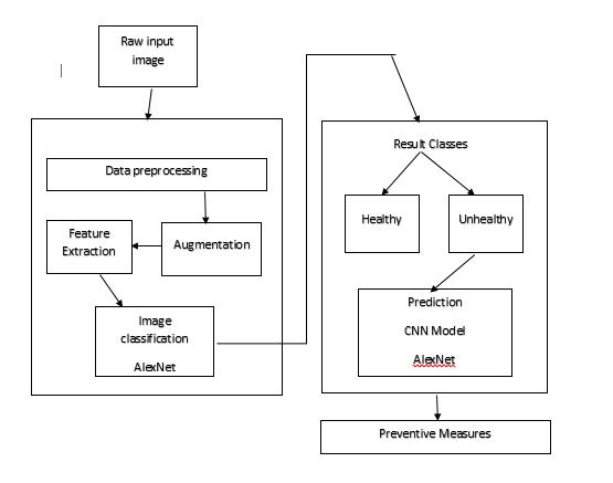 Due to this, the system suggested in this research uses a graphical user interface to both detect disorders andofferapreventativeaction. Themajorsummaryofthe suggested framework is provided by the contributions below: In order to diagnose diseases, we first use image processingtechniquesonleafdatasets.Second,weusethe AlexNet architectures to categorize the processed leaf images. Thirdly, the accuracy of the categorization of all leaf diseases is examined in this work. We examine and