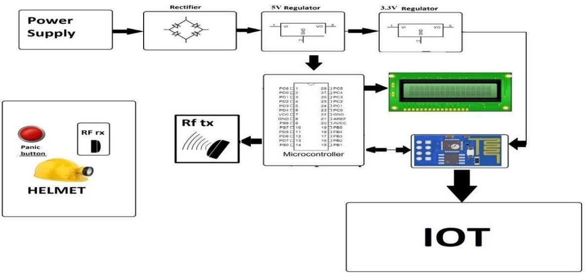 Mininghasbecomeanecessarytasktotheextractionaswellascreationofvariousgoods,infrastructureandmanyservices whichenhances the quality of life. As a result,amining trackingandasafetyhelmetisproposedbyourteamtothemining industryusingAtmegamicrocontrollerbasedcircuit.ThismakesuseofRFcircuit[2].RFstandsforradiosignalsandparticularly thesesignalsarebeingusedforthisprojectastheycanonlysustainandsuittheconditionsofaminingsite.Blynkapplicationisused togetthenotificationsandcloudisalsoprovidedbythesameplatform.Thenotificationisreceivedtothetargetedmobilephone orawebpage.However,theutilizationofheavymachineryandthemethodsperformedduringexcavationsresultinrisksinall typesofmining[3].TheChasnalaminingdisasterthattookplacenearDhanbadintheIndianstateofJharkhandalmostkilled372 miners.Thiswasconsideredasoneoftheworstdisastersintheminingindustry.Once,apersonentersthemine,theywouldnot beawareofexternalenvironmentalconditionsthattakesplaceinsideandoutsidethemineandthiswouldresultindiscovering suchdevicesforthesafetyofthemineworkers.