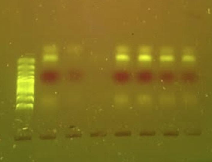 150V for 30 minutes. SYBR safe green loading dye was used with lithium bromide buffer. An EDVOTEK TruBlu2 DNA illuminator was used to view the DNA. Wolbachia pipientis DNA is identified at 438 kilo basepairs (kbp) and insect DNA is identifiedat708kbp.