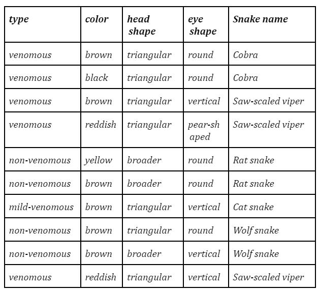 So to predict what species of the snake using natural languageinwhichthepersondescribesthesnakeinwords and based on their visual view this research paper used different classification algorithms. First, a lot of preliminary processing, character extraction, and classification was done on the data. Then four machine learning algorithms which are naïve Bayes, K nearest Neighbor, support vector Machine, and Decision trees J48 wasusedfortrainingandclassificationofdata.