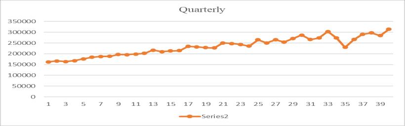 Theyearlydataisseemingtobenon seasonal.Theplotof yearlydatashowsatrendline.Tripleexponentialsmoothing technique is only applicable for seasonal data. Here triple exponential smoothingcan’t beapplicable foryearlydata. Theplotofyearlydataisshowninfig.4.
