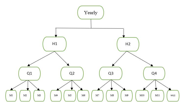 consists of12 months data (M1,M2,M3,M4,M5,M6, M7, M8,M9,M10,M11,M12).Level2consistsof4quartersdata (Q1,Q2,Q3,Q4).Level1consistsof2halfyearsdata (H1, H2).Thetoplevel(level0)consistsofyearlydata.Theseare representedinahierarchy.