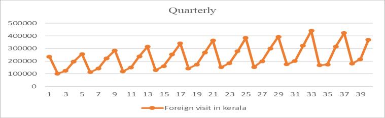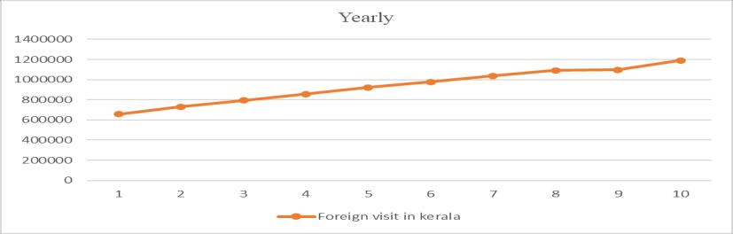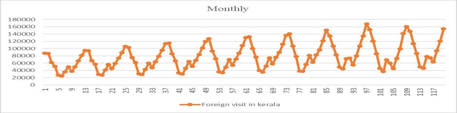 FromKeralatourismstatistics,thedataofnumberofforeign touristsvisitedinKeralaareavailable.Themonthlydataup to 2019 is available. For this study, over 10 year data of numberofforeigntouristsvisitedinKeralaareselected.The datadividedintotrainingdataandtestdataforcalculations. Thefirst6 yeardata(2010 2015)aretakenastrainingset and the next 4 year data (2016 2019) are taken as test data. The test data are used for validation. Comparison of different forecasting approaches are performed using the error variationin the forecastedvalue and actual valueof testdataset.