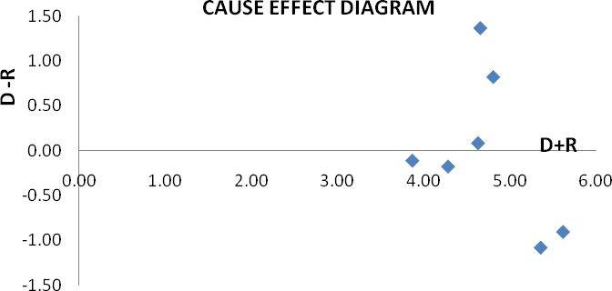 Step 7: Let i=j;Di = D and Ri = R. A causal diagram can be acquired by mapping the datasetof (D + R, D R), where the horizontalaxis(D+R)ismadebyaddingDtoR,andtheverticalaxis(D R)ismadebysubtractingDfromR.Inthisstep,(D +R)isdefinedasprominenceand(D R)isdefinedasrelation.‘‘Prominence’’showshowimportantthecriterionis,whereas ‘‘Relation’’maydividethecriteriaintothecauseandeffectgroups.Whenthevalue(D R)ispositive,thecriterionbelongsto thecausegroup.Ifthevalue(D R)isnegative,thecriterionbelongstotheeffectgroup.ProminenceandRelationvaluesare providedinTable5.7.