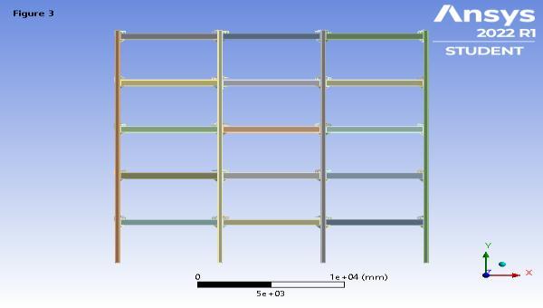 A five storied building frame is modelled in the ANSYS software without damper. Fig 38 shows the model of a buildingframewithoutdamper.