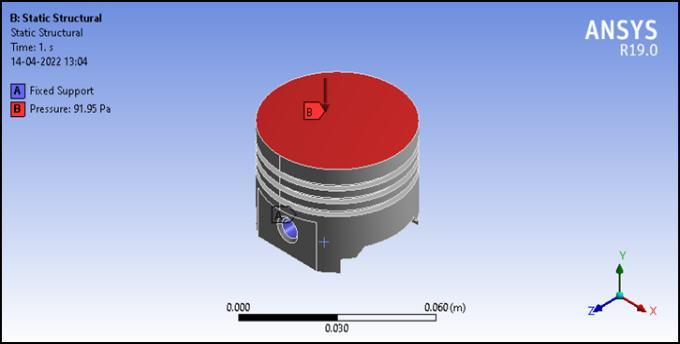 For structural analysis, we have taken fixed support at thesurfaceofthepinhole,andpressureforceisgivento thepistonheadasshowninfig 3.