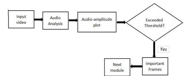 The entire sports video is fed into the librosa audio processor[8].Athresholdenergyforchunkisdefined.The duration of the video from which the amplitude of the crowd cheer ascends till it descends is noted down if the energy chunk crosses the defined threshold. Sub clips are extracted from the second the amplitude rises till the secondamplitudefallsdownthethreshold.[16]