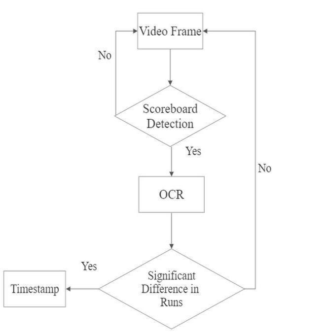 so,isthecase,thenasub clipwith15secondsintervalon eitherendsfromthattimestampareextractedandmarked asimportantevent.SimilarlyforCricket,alltheannotated scoreboard images are trained on yolo model using transferlearningmethod[12].TheframesoftheVideoare then passed through Object Detection model in order to detect for scoreboard in that particular frame[14]. If so then the frame is considered for processing in OCR module.