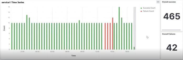 Thekibanadashboardalsohasatimeseriesgraphforeach service.Thetimeseriesgraphforoneoftheservicesisas shown in Fig. 4. The failure count is represented by a red verticalbarandthesuccesscountisrepresentedbyagreen vertical bar. It also displays the overall success rate and overallfailurerate.