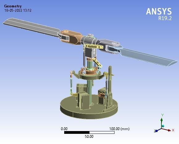 The geometry is the file import from the assembled helicopter mechanism in the Solidworks file which is convertedintotheSTPfileforamoreaccuratemodel,STP filemakesAnsysmeshtheobjectveryfinetogetthebetter results