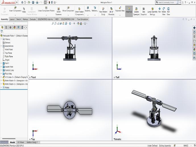 majorassemblyofthehelicopterrotormechanism.Wehave designedeverycomponentbyusingSolidworkssoftware.In Solidworks, we have used different entities to design and model a component Wefirstmodel simpleandindividual componentswithsomedesignstandardsthisarerelatedto the main component Then this component is attached to sub assemblies with related components this process will reducetheeffectontheconstructionofthemainassemblyto avoidconfusionandconstraintsintheassembly.Thenthese sub assemblies are together into a single assembly as the mainassembly.Hencethefinalhelicoptermechanismpartis assembledandhasamechanicalmovement.Wehaveused the Ansys software to test the mechanism with Rigid dynamicAnalysisandComputationalFluidDynamics(CFD) AnalysisResults