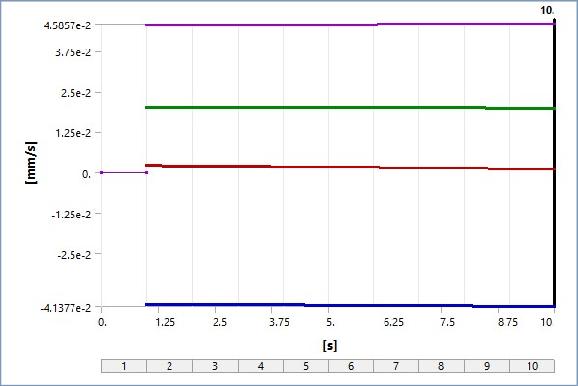 Theabovegraphisshownthevelocityproberesultofrotor blade1inthehelicoptermechanismthevelocityprobetakes on the y axis and time in x the axis. the velocity will decreaseverygraduallyaccordingtothetimeonthex axis thedifferentaxisvelocityoccursat10secondsatthex axis is0.0010mm/sandonthey axisis0.01974mm/sandon thez axisis 0.04138mm/s