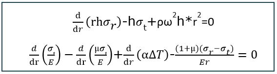 ThetoolusestheMansonmethod[1]governingequationswhicharefinite-differenceformulationstocalculatetheTangential andRadial stressesina rotatingdisk.Ina thinrotatingdisk ofvariablethickness,thestateofstressatanyradiuscanbe completelydefinedbythetwoprincipalstresses,theRadial(σr)andTangential(σt)stresses.Belowarethetwofundamental governingequationsusedtoderivethetwounknownstressesfromtheMansonapproach[1]