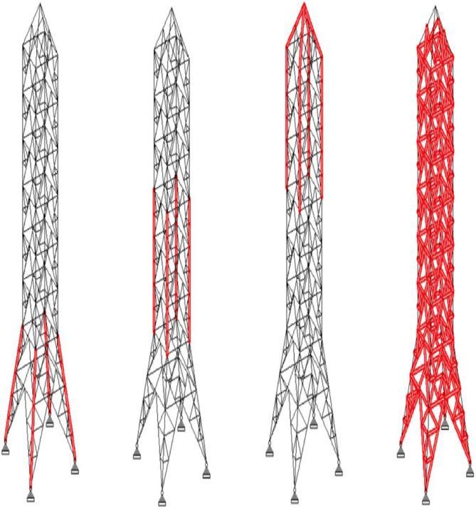 Theexistingtower,modelUA,hasapartiallytaperedform, with thecolumn member sections changing at three different heights (Fig. 6).Symmetries are maintained on both the axes in the plan view, making it simple for the designer in estimating and assigning the possible loads acting on the tower structure. Angle sections are used in