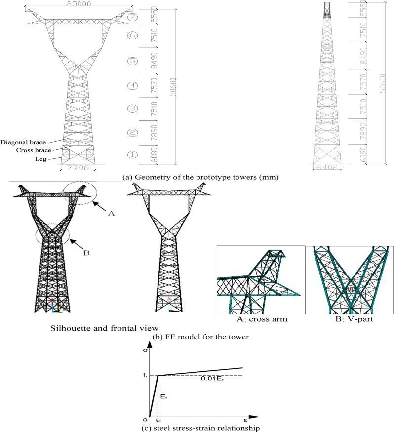 The finite element (FE) model of the prototype tower is developedbyusingANSYSasshowninFig.5(a).BEAM188 3D beam element withuser-defined profile is used to simulate leg members and cross-bracemembers. This element works best with the default choice in solutioncontrol. 3D uniaxial tension-compression truss element LINK8 withoutbending capacity is used to simulate diagonal-brace members. Materialnonlinearity and large deflection capabilities are available for bothBEAM188 and LINK8 elements. Both ends of the braces are assumed tobe pinned. The stress-strain relationship of steel is shown in Fig. 5(b).According to the investigation of power transmission tower collapseaccidents, the failure normally would not occur at thelegfeetconnection,exceptthattheboltsusedtofixleg feetaresabotaged.Therefore,thebottomendofthemodel is fixed. Geometric nonlinearityis considered in the finite elementmodel.