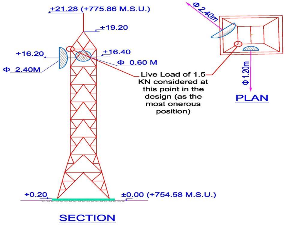 Therealtowerispositionedatanelevatedbaseof20mm above the existing ground level. As shown in Fig. 7 there are two antennas of different sizes, having radius 1.2 m and0.6m,facingdifferentdirectionsonthetower.Looking at the plan and section, the positions of the antennas can be known. Their positioning is fixed and cannot be changed as they are directed towards the satellite that transmits signals to these receivers. Orientation is critical, hence the antennas shall be fixed at the exact height and direction as per the recommendations from the service provider. The live load is considered as 1.5 kN. By engineeringjudgement,thisisthemostonerouscondition, and hence will display the worst condition for which the towerwillbedesigned.