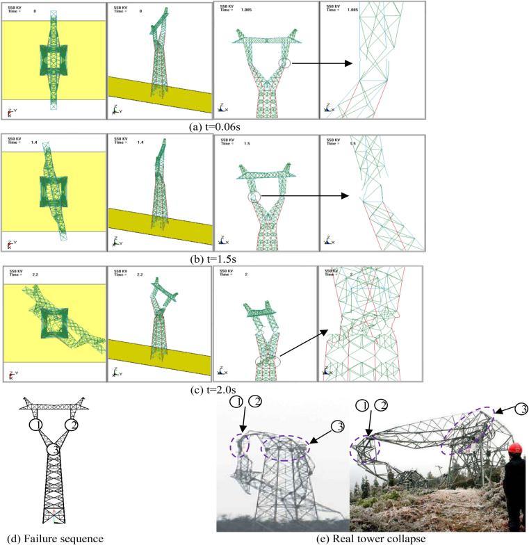 Fig. 2.4 shows the progressive collapse process of the tower. At 0.06 s, the unbalanced torsion due to line fracture leads to the fracture of a few structural members