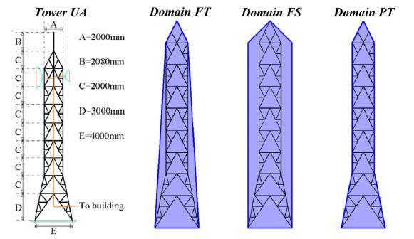 The19mheightfour-leggedloomfeaturessquareonplan configuration, partially-tapered vertical profile and triangular shaped tip to allow antenna fitting. This structure represents a conventional geometry for lattice telecommunication towers and will be referred in this worktoasoriginaltowerUA.Three2Ddistinctgeometries were formed, all based on the perimeterlines of the tower UA; (i) a fully-tapered (FT), (ii) a fully-straight (FS), and (iii) a partially-tapered (PT) (Fig.2.3). The analysis of the domain to produce the most consistent and realistic outcomes shall be considered in the creation of the novel skeleton.