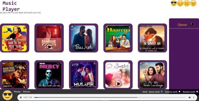 Theinterfaceof emotion basedmusic playerconsists of Logo and the tagline as “Let music flow and enrich your soul”.The interface has all songs aligned according to the emotions designed i.e Happy, Sad, Neutral, and Angry. There are three types of mode described such as Queue mode, Emotion Mode and Random Mode. The emotion detected by the user is Happy and the song is played accordingly as shown in figure 2