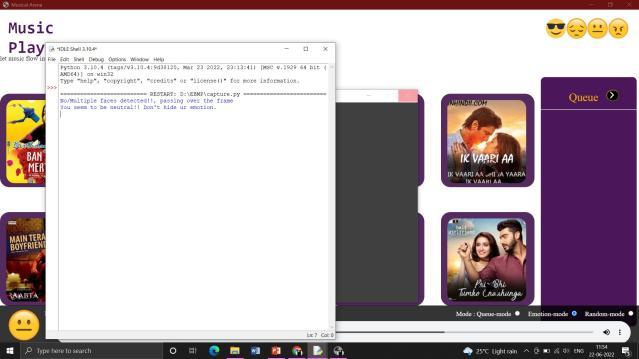After successful detection of the user’s mood and the songis played, there will be a message produced in the background according to the emotion detected as shown in figure 5.