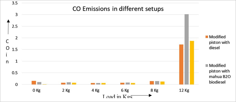 Inference: Higherfuel/airratiocausestheemissionofCO.DuringtheinitialloadstheCOemissionsarecomparativelysmall andthereisslightdifferencebetweendifferencesetups.Butathigherloadsitisincreasingbecausewithincreaseintheload thefuel/airrationincreasesThiscausesrichfuel/airmixturehenceresultinginCarbonmonoxideemissions.
