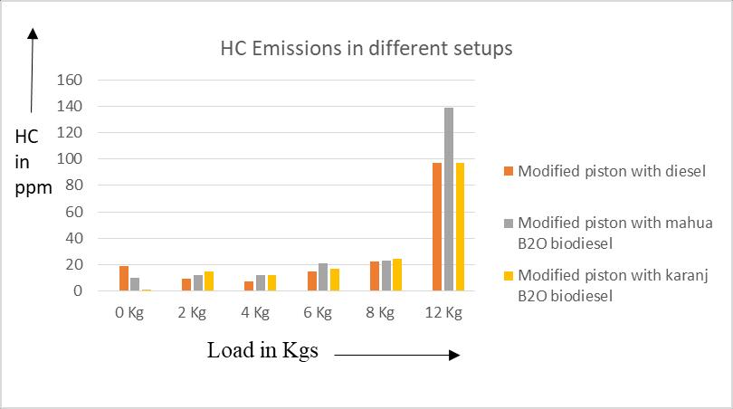 Inference: Higherfuel/airratiocausestheemissionofHC.DuringtheinitialloadstheHCemissionsarecomparativelysmall andthereisslightdifferencebetweendifferencesetups.Butathigherloadsitisincreasingbecausewithincreaseintheload thefuel/airrationincreasesThiscausesrichfuel/airmixturehenceresultinginhydrocarbonemissions.