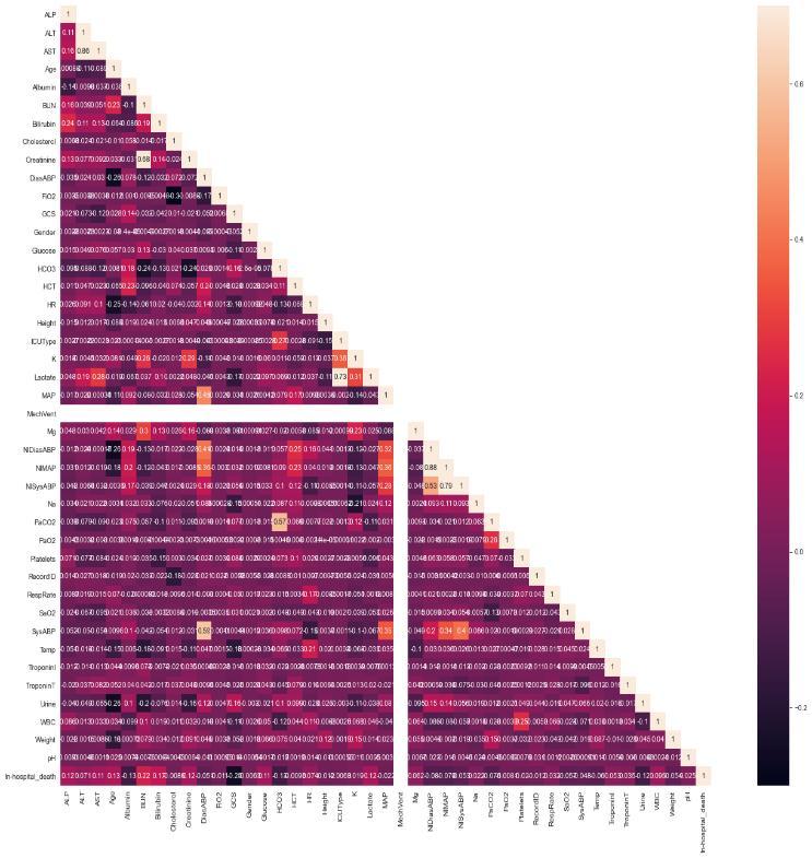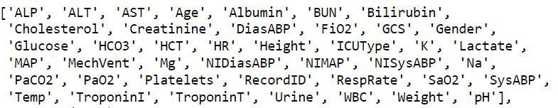 The most important features from dataset are as [ALP’, ’ALT’,’AST’,’Age’,’Albumin’,’BUN’,’Bilirubin’,’Creatinine’, ’DiasABP’,’FiO2’,’GCS’,’Glucose’,’HCO3’,’HR’,’K’,’Lactate’, ’MAP’, ’MechVent’, ’Mg’, ’NIDiasABP’, ’NIMAP’, ’NISysABP’, ’Na’ , ‘PaCO2’, ’PaO2’, ’Platelets’, ’RecordID’, ’RespRate’, ’SaO2’, ’SysABP’,’Temp’, ’TroponinI’, ’TroponinT’, ’Urine’, ’WBC’,’Weight’,’pH’]Forfindingcorrelationwehavehad taken help of HeatMap . This have helped us to figure out that there is minimum correlation of following features [’Gender’,’Cholesterol’,’HCT’,’ICUType’,’Height’] with output so we can consider to drop them. Fig 3 shows correlationoffeatures.