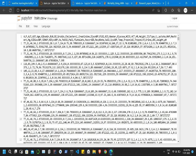 For training and testing, we have considered a random data set. The Dataset contains 3999 patient entries with 42 features and a multilabel status which describes whether the patient survived or not with two different values as 0 and 1. A snapshot of the dataset used is displayedinAppendix1.